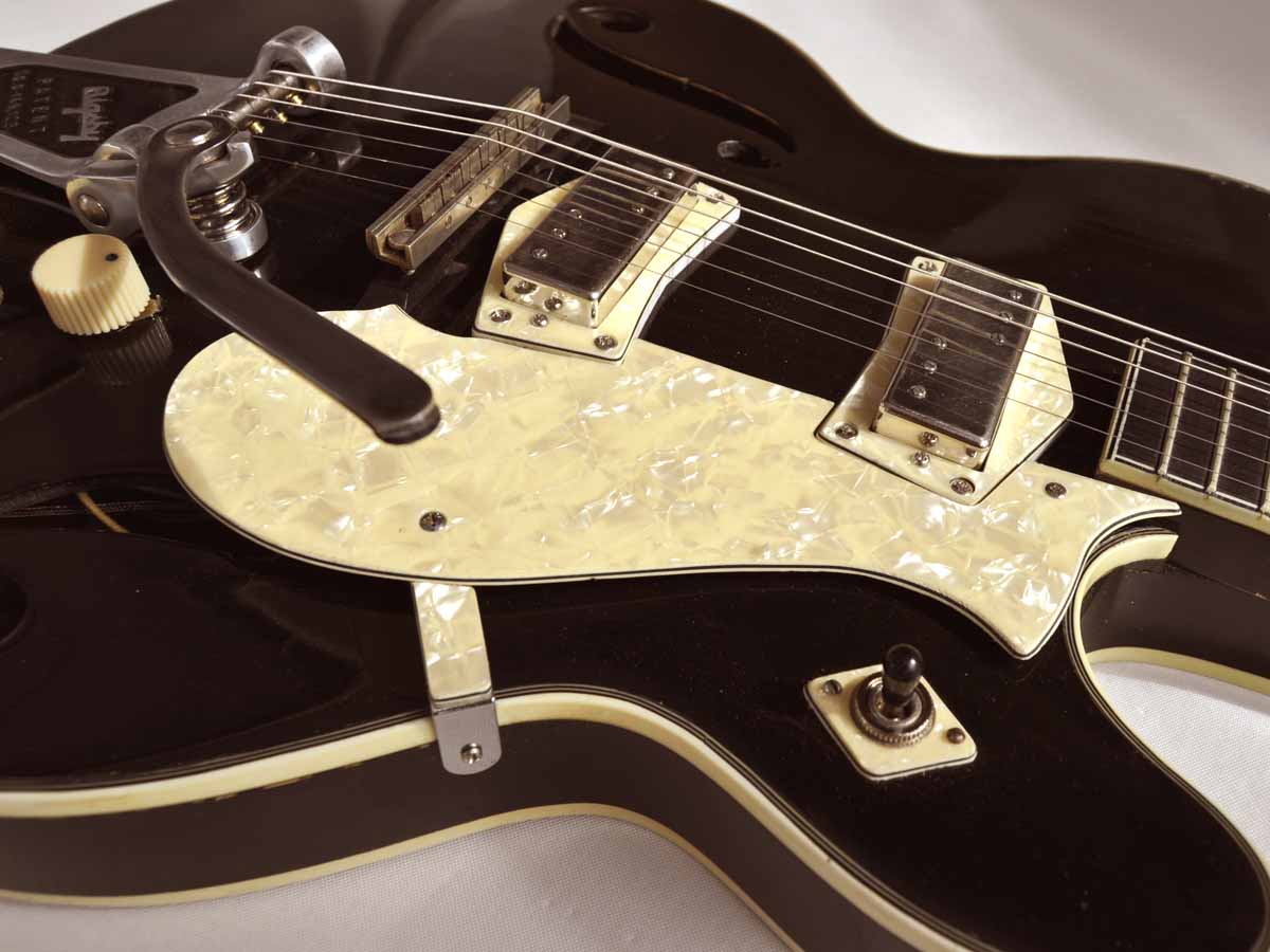Ein gebrauchtes Bigsby B7, eine stimmige alte Brücke, einen Satz alter amerikanischer Kluson Mechaniken und auch vier Danelectro Potiknöpfe, die den originalen mehr als nahe kommen, hatte ich sogar noch im Kellerlager. Dann begann das Gefummel des Elektronikeinbaus: Alles musste „im Freien“ komplett (und vor allem richtig) verdrahtet werden und dann mithilfe von Drahthaken und Nylonschnüren durch die entsprechenden Öffnungen ins Gitarreninnere verfrachtet werden. Nichts für schwache Nerven! Nach vielen Stunden Frickelei war dann alles am rechten Platz und die schwarze Schönheit konnte besaitet werden. Das Ergebnis ist sensationell! Die Gitarre spielt sich traumhaft, sieht umwerfend aus und klingt überragend gut! Die Mühe und der Materialeinsatz haben sich mehr als gelohnt!